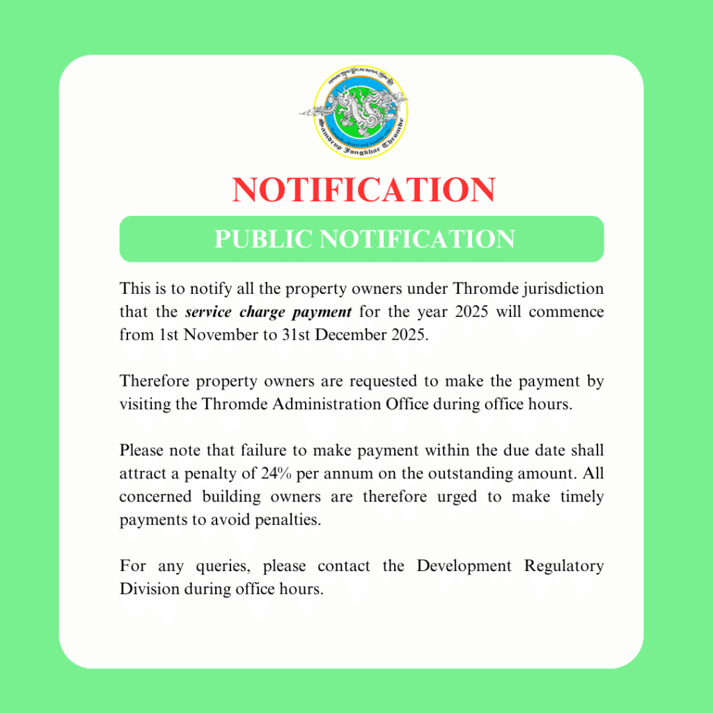This is to notify all the property owners under Thromde jurisdiction that the service charge payment for the year 2025 will commence from 1st November to 31st December 2025.